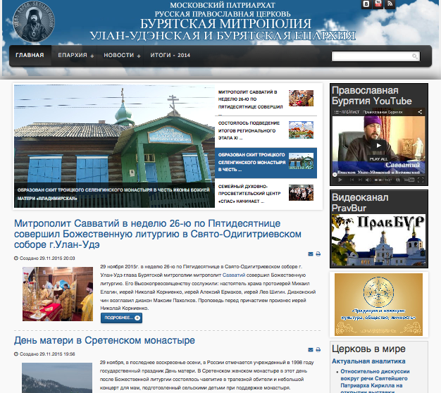 Почему же важнейшее духовное событие не удостоилось не только проповедей и назиданий, но даже простейшего упоминания? Быть может, просто сайтами занимаются люди несведущие, а у духовного начальства много забот, и, как говорится, "не доходят руки"? Или Интернет для них, что называется, терра инкогнита? Что ж... для этого у нас есть "продвинутые" архиереи, знающие сеть не понаслышке и даже ее активные пользователи. Таких не много, но они есть. Особенно в этом плане выделяется на общем фоне митрополит Улан-Удэнский и Бурятский Савватий. Он активный участник Фейсбука, причем не только в обновлениях статуса, но и в комментариях к статусам других пользователей, доступен для неформального и живого общения. Вот как раз там, на своей странице он опубликовал видео проповеди на последней церковной службе. В ней архипастырь немало места посвятил начавшемуся Рождественскому посту, при этом очень эмоционально обратился к пастве с призывом звать "всех знакомых и друзей" на "генеральную уборку", как он метафорически называет пост. В том числе упомянул и о воздержании в этот период от "пустого времяпровождения" в социальных сетях. Прекрасно. Но не на блуждающего ли по сетям должен быть рассчитан в первую очередь епархиальный сайт? Открываем сайт Бурятской епархии и видим... маленькое региональное подобие патриархийного "старшего брата":